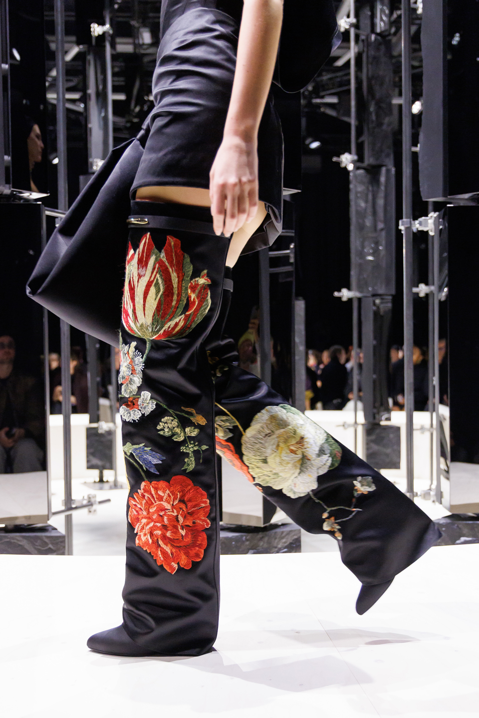 Jubah bertabur motif macan tutul, sarung tangan berukuran besar, tas kulit biru cobalt, dan sehelai atasan yang terbuat dari rangkaian permata mendominasi panggung peragaan busana. Tak lupa, Burton mendedikasikan beberapa tampilan ultra-feminin yang mempergunakan materi jacquard bertabur motif bunga yang ia kreasikan dari kimono tua. Sentuhan akhir diberikan Burton lewat imbuhan kalung penuh pernyataan yang mewah serta anting-anting berukuran besar, menyempurnakan jajaran gaun hitam berdetail renda yang menutup rangkaian koleksi Givenchy untuk musim gugur/dingin 2026.